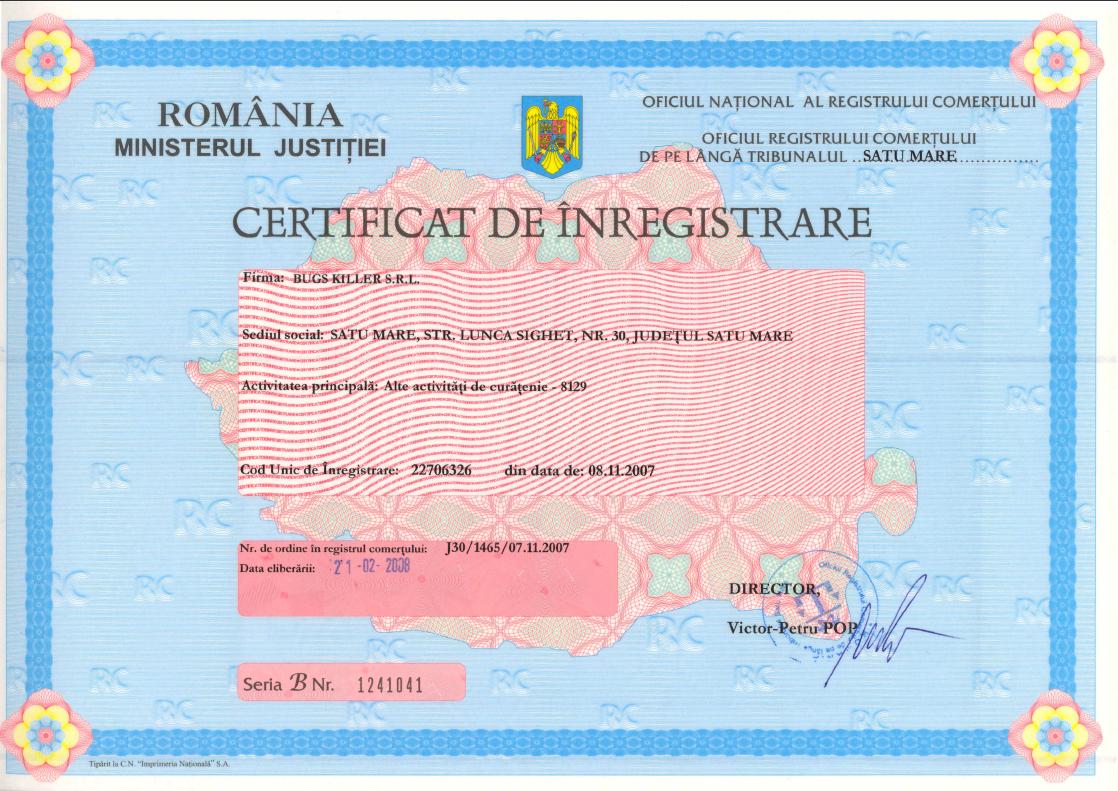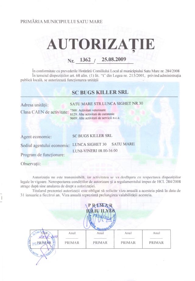 In conformitate cu prevederile Hotararii Consiliului Local al municipiului Satu Mare ill. 284/2008 in temeiul dispozitiilor art. 68 alin. (1) lit. "1" din Legea nr. 215/2001, privind adrninistratia publica locala, se autorizeaza functionarea unitatii SC BUGS KILLER SRL