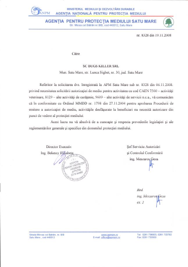 Catre SC BUGS KILLER SRL Mun. Satu Mare, str. Lunca Sighet, nr. 30, judetul Satu Mare Referitor la solicitarea dvs. inregistrata la APM Satu Mare sub nr. 8328 din 06.11.2008. privind necesitatea solicitarii autorizatiei de mediu pentru activitatea eu cod CAEN 7500 - activitati veterinare, 8129 - alte activitati de curatenie, 9609 - alte activitati de servieii n.e.a, va comunicam ca in conformitate cu Ordinul MMDD nr. 1798 din 27.11.2004 pentru aprobarea Procedurii de emitere a autorizatiei de mediu, activitaiile desfasurate la beneficiari nu necesita autorizare din punct de vedere al protectiei mediului.